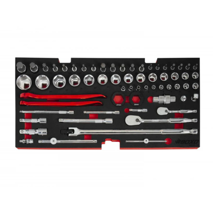 Each tool is encased in an EVA foam tool storage solution tray making tools fit securely in drawers to keep organized and no shifting during motion. The mirror chrome finish on the tools protects the tool set against corrosion, cleans up easily and looks great too. Included are 1/4" & 3/8" 90-tooth ratchets, extensions and 6-point sockets. Our wrenches in this set feature smooth jaw open ends, 12-point box ends with positive grip and 15° offset which provides clearance and ease of use during tight applications. Each wrench is marked with the size on both sides to quickly identify the size you need. The screwdrivers and pliers are equipped with ergonomic handles for comfort and provide extra grip during use.