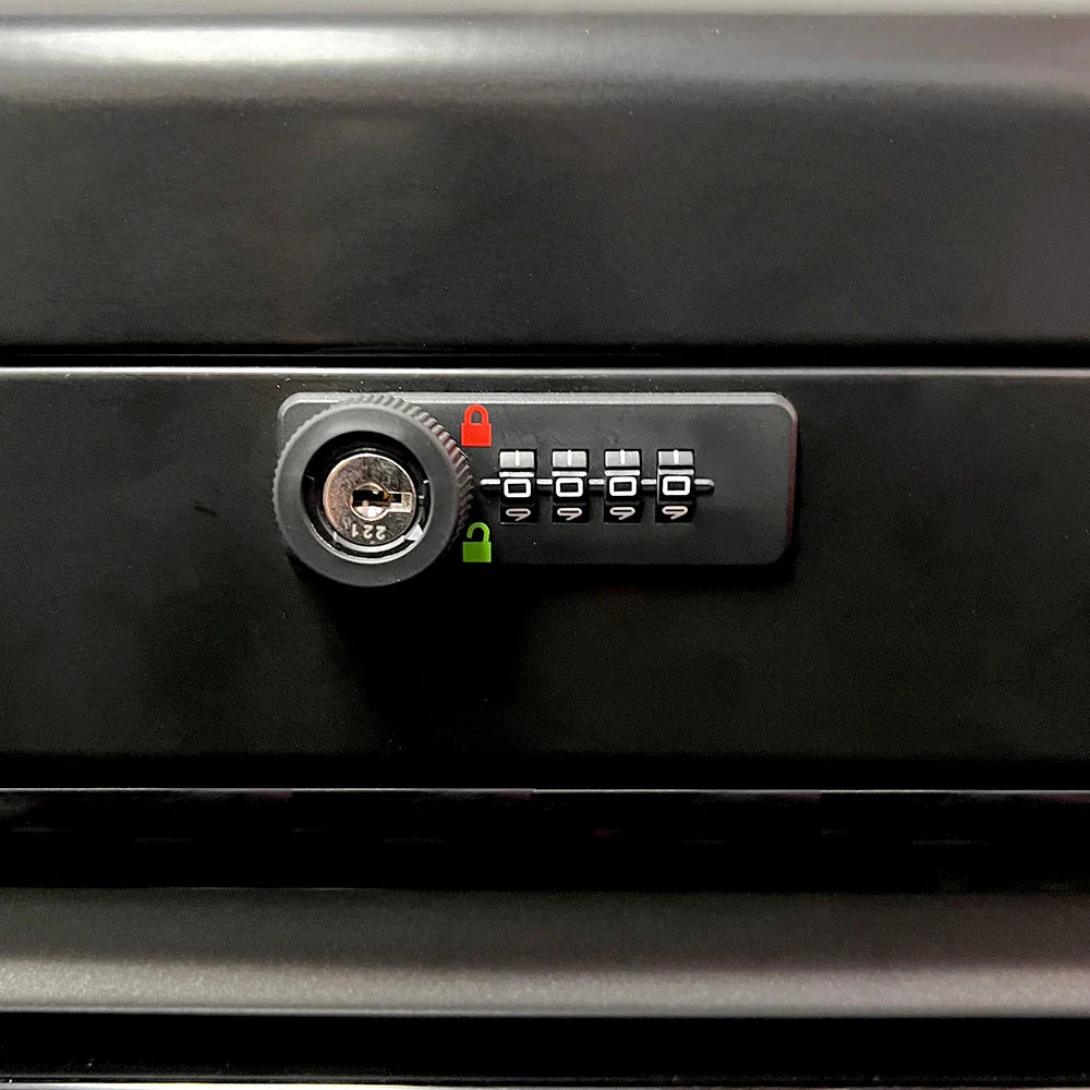 - Features key lock and digit-lock resettable combination lock system